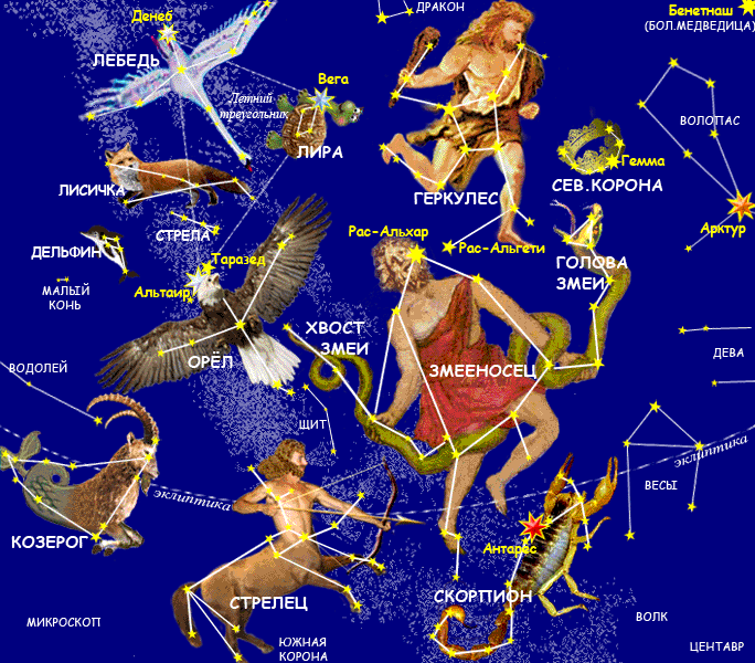 Персей и т.п.) или быта (Весы, Лира и Андромеда,) или из быта (Весы, Телега).